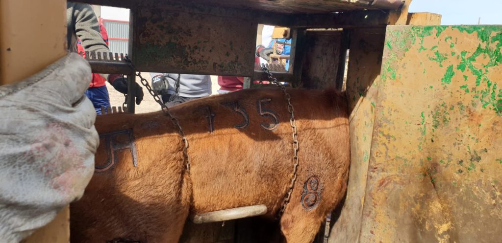 En una mañana soleada, Pedrolera fue marcada con el número 735, que le acompañará en el costillar durante el resto de su vida, junto al distintivo de la ganadería. En el momento de la marca estuvo presente como representante del Ayuntamiento, el Concejal de Fiestas, Miguel Cimorra, y junto a él, ejercieron las labores de padrinos del animal Celestino Ortega, quien fuera primer concejal de fiestas de Pedrola con un gran vínculo personal con la familia Arriazu, e Imanol Sánchez, torero local y colaborador habitual de la ganadería.