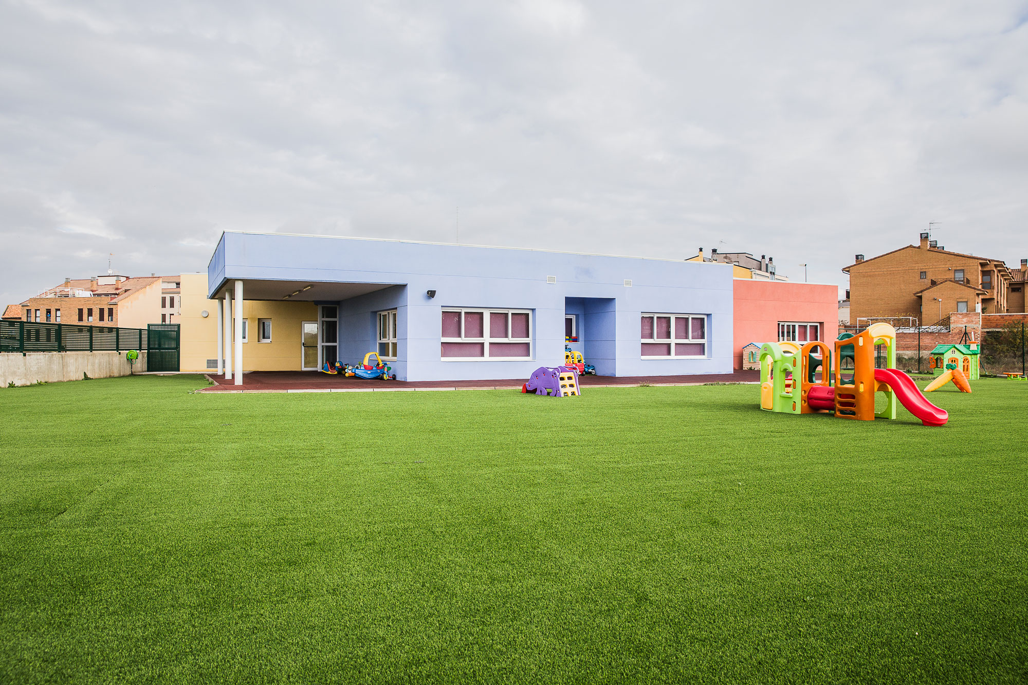El patio consta de una zona de césped natural, un pequeño huerto y una zona de recreo cubierta, parte con césped artificial y otra parte de losas anticaídas.